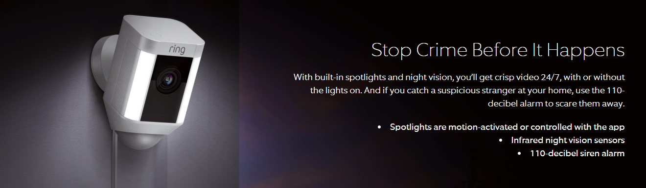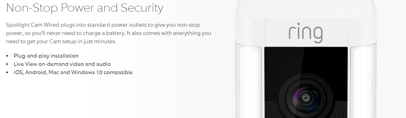 Ring Spotlight Cam Wired is the first plug-and-play HD security camera with built-in spotlights, two-way talk and a siren alarm. It lets you watch over your property from your phone, tablet and PC. With Spotlight Cam Wired, you can create customizable motion zones that let you focus on the most important areas of your yard. When anyone enters your motion zones and triggers your motion sensors, you’ll get an instant alert on your phone, tablet and pc. Answer the alert, and you can see, hear and speak to people on your property from anywhere.