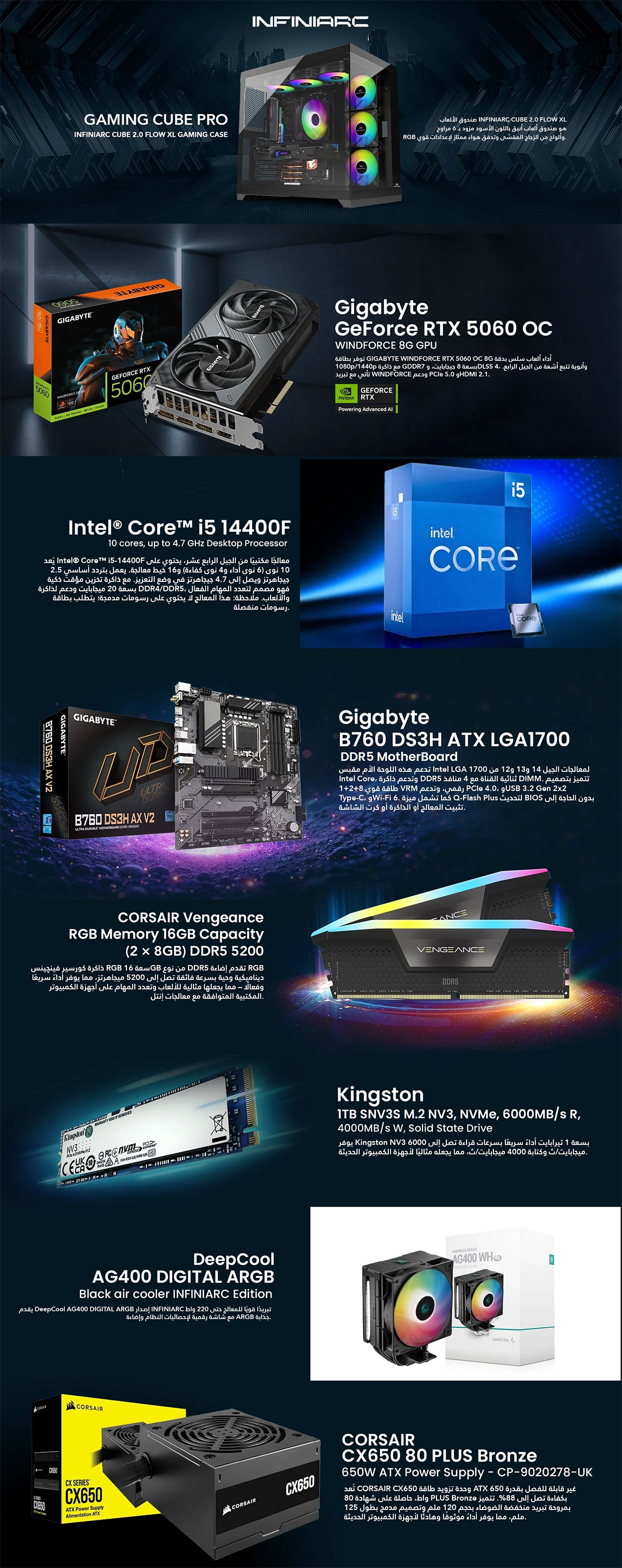 معالج انتل كور i5 -14400F ( الجيل 14) 32 جيجابايت رام جيجابايت 8) 5060 انفيديا جي فورس آر تي اكس) 1 تيرابايت اس اس دي